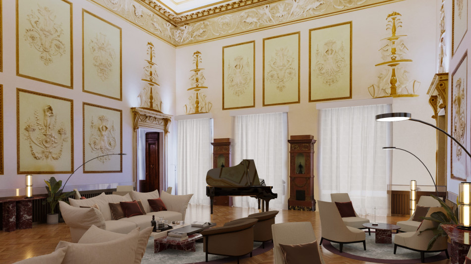 Das Projekt umfasst auch die Gemeinschaftsbereiche. Die Neugestaltung soll dem Frühstücksraum und dem Restaurant zeitgemäße Eleganz, der Bar einen neuen, erlesenen Charakter und der Lobby ein warmes, edles Ambiente verleihen. Ein neues Beleuchtungs- und Einrichtungsprojekt wird den Musiksaal aufwerten und seine einzigartige Atmosphäre hervorheben, während seine historische Identität erhalten bleibt.