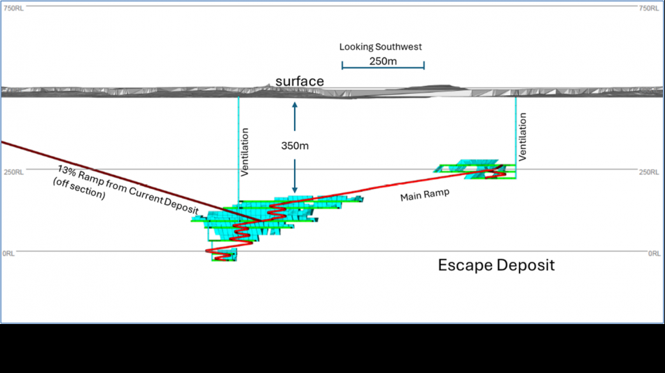 Die Lagerstätte Current wird über ein Portal von der Oberfläche aus erschlossen. Die Produktionshochlaufphase ist auf 18 Monate angelegt und sieht eine nominale Jahresproduktion von 0,9 Mio. Tonnen Lohnaufbereitungsmaterial vor. Die Haupt-Rampe führt weiter in Richtung Lagerstätte Escape, wo die Produktion im hochgradigen Escape-Bereich im vierten Produktionsjahr beginnen soll.